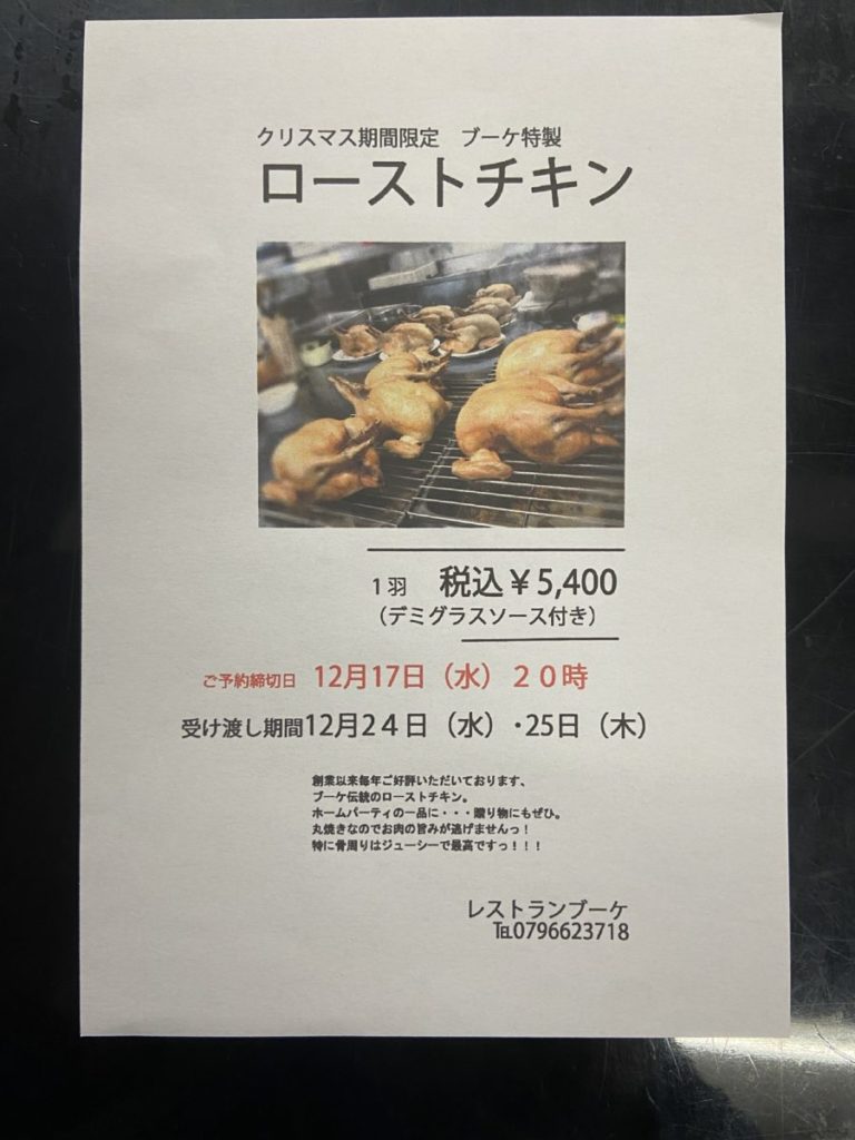 クリスマス期間限定、ブーケ伝統の味、特製ローストチキンご予約受付中です!