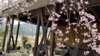 2026年4月5日(日)ランチタイムは11:30開店となります。テラス席の枝垂れ桜が満開です。↓テラス席から見下ろすソメイヨシノも。↓テラス席がおすすめです。