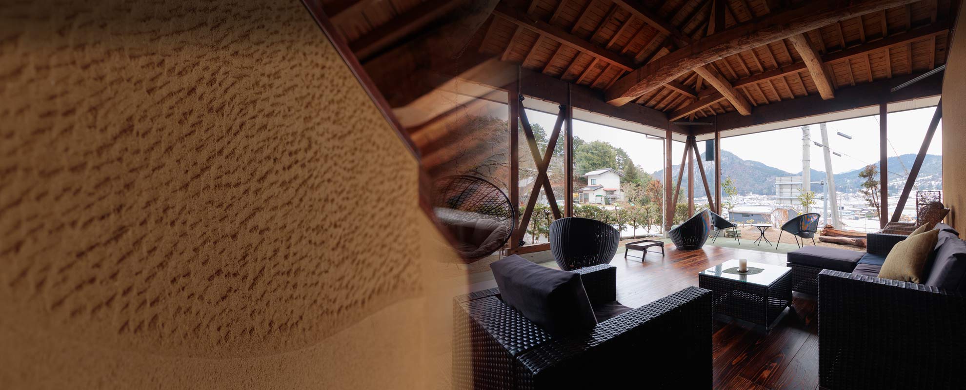 テラスの建築を手掛けたのは地元の作家。通常の建築ではあまり使わない素材で空間を構築。古くからの親友、左官職人“久住 有生”氏に壁の創作を依頼。二人のコラボがこのテラスならではの芸術的で甘美な非現実空間を演出しています。
